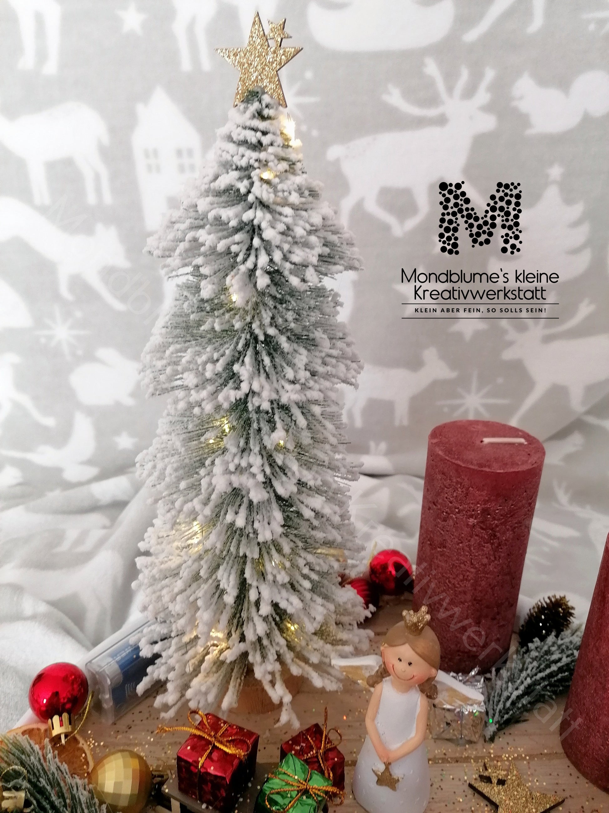 Dekoriert mit Kugeln und Sternen in Gold, Zweigen, kleinen Geschenkpackerl, Orangen/Zimtstangen, Glitzersternen, Led-Bäumchen, Weihnachtsmann & Engelchen