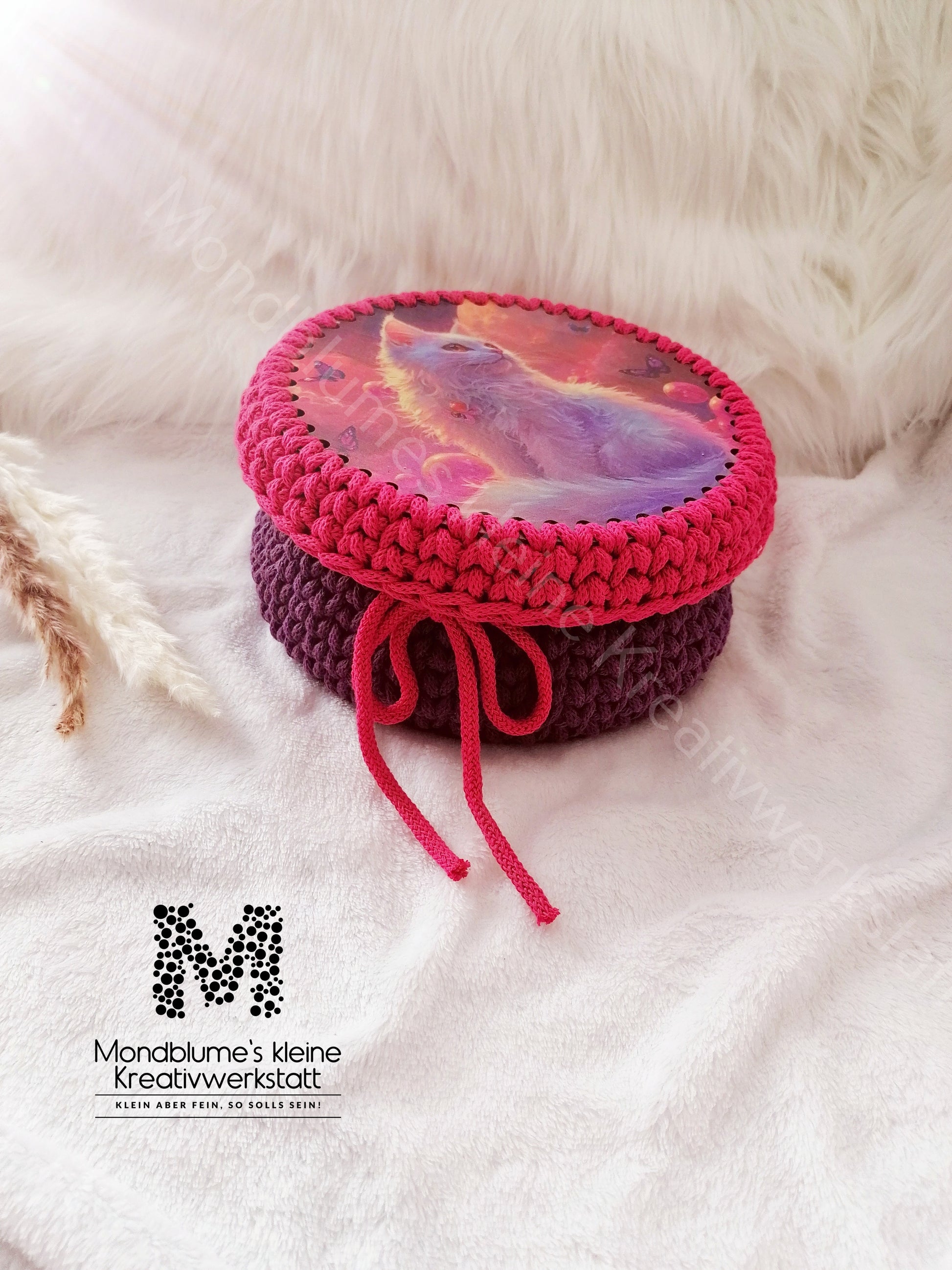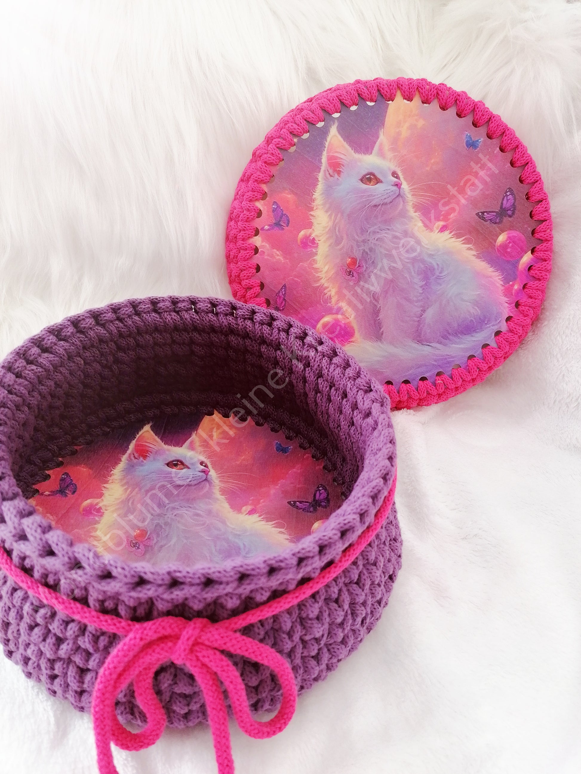 Diese handgefertigte Aufbewahrungsbox verbindet praktischen Stauraum mit liebevoller Gestaltung. Die runde Form und der abnehmbare Deckel machen sie vielseitig einsetzbar – ob für Schmuck, kleine Accessoires, Nähutensilien oder andere Alltagsgegenstände. Das verspielte Katzenmotiv, innen und außen, verleiht der Box einen besonderen Charme und macht sie zu einem Blickfang in jedem Raum.