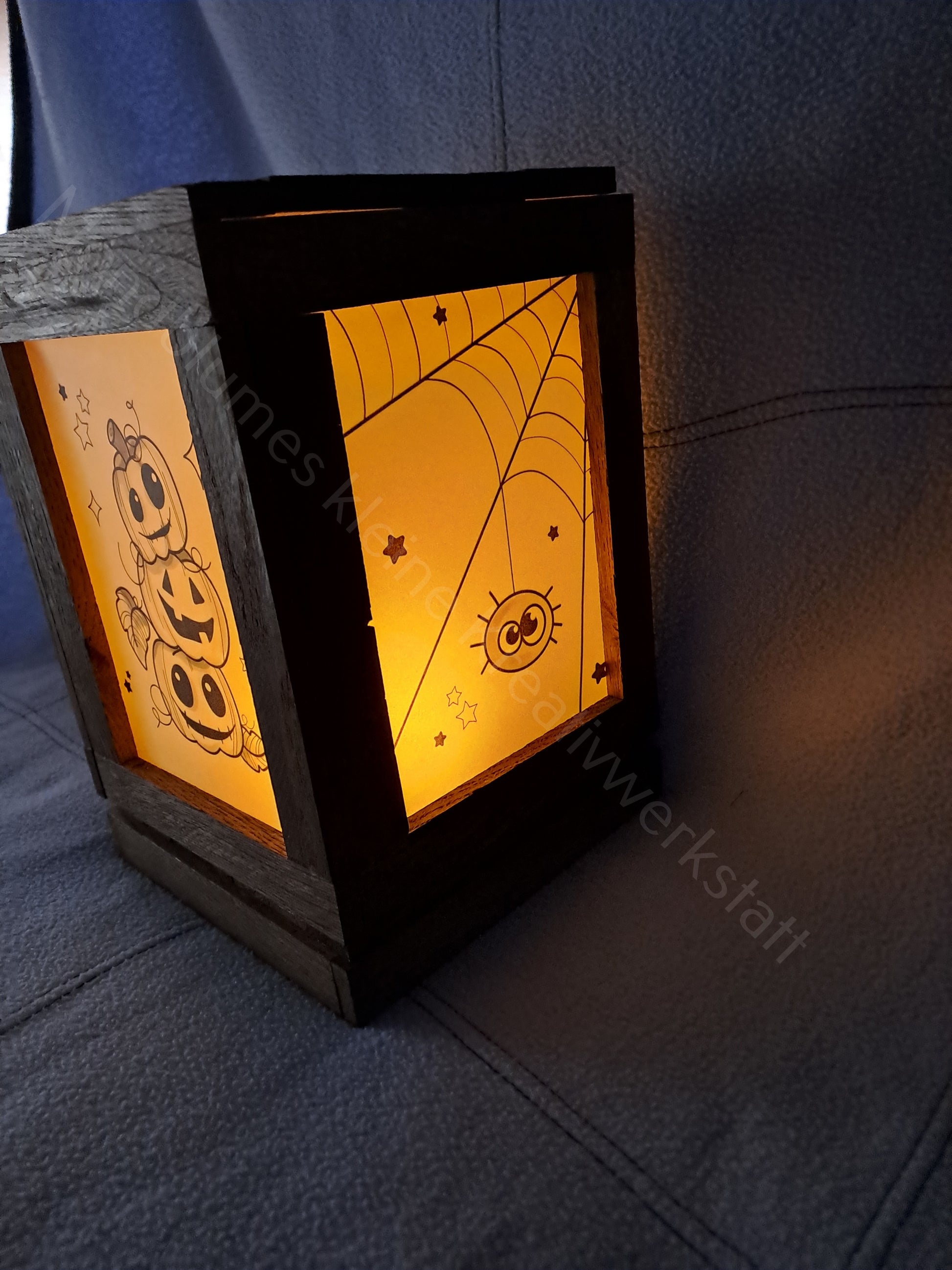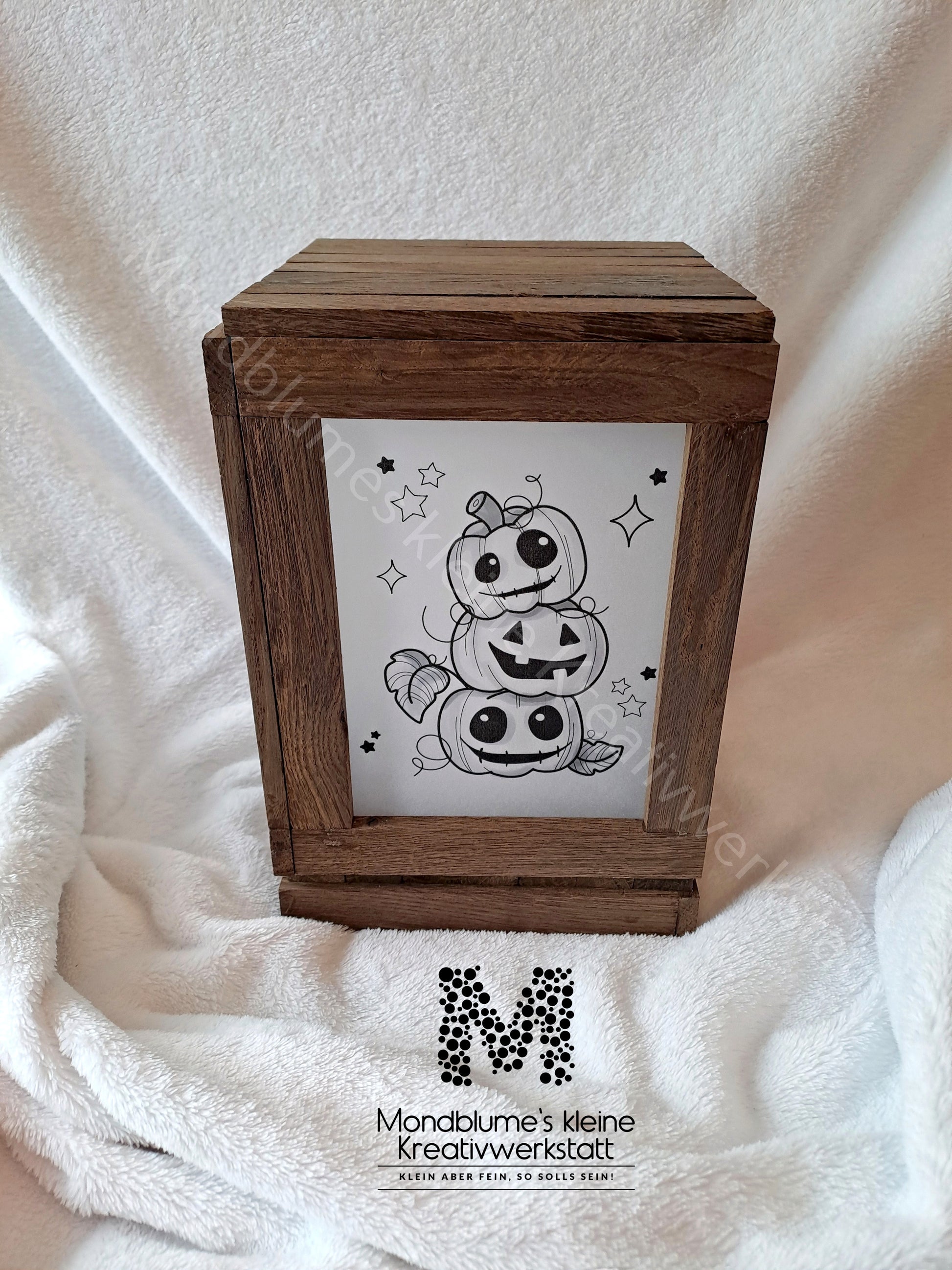 Diese zauberhafte Laterne aus unbehandelter dunkler Eiche vereint rustikalen Charme mit stimmungsvoller Halloween-Deko. Der abnehmbare Deckel macht das Einsetzen LED-Lichtern besonders einfach, während die liebevoll gestalteten Seitenwände mit Halloween Motiven eine gemütlich-gruselige Atmosphäre zaubern.