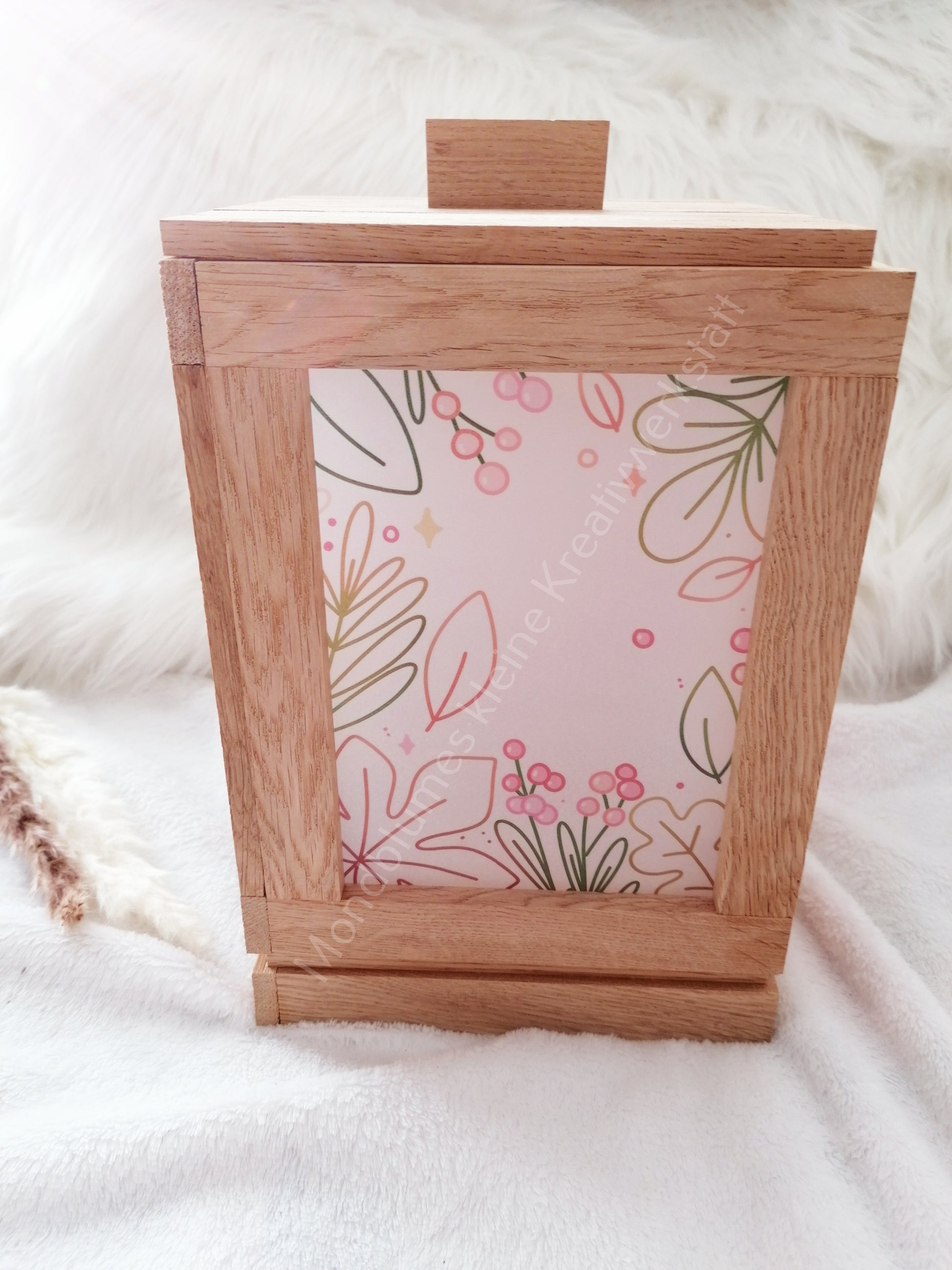 Diese liebevoll gestaltete Laterne aus heller Eiche vereint natürliche Holzoptik mit stimmungsvoller Herbstdekoration. Der abnehmbare Deckel ermöglicht einfaches Platzieren von LED-Lichtern (nicht im Produkt enthalten), während die dekorativen Seitenwände herbstliche Akzente setzen und eine warme, gemütliche Atmosphäre schaffen.
