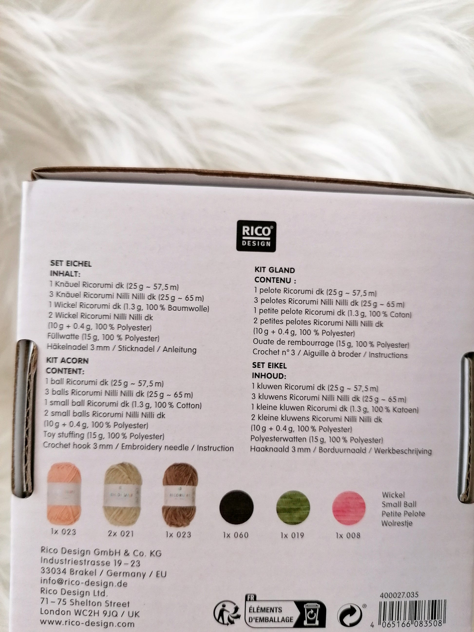 Das Häkelset bietet alles, was zum Häkeln des bezaubernden Baby-Schnuffeltuchs in Form einer Eichel benötigt wird. Es enthält eine detaillierte Anleitung mit ausführlichen Schritten, eine Näh- und Häkelnadel sowie die passende Füllwatte für den Kopf. Die Wolle umfasst vier Knäuel der kuschelweichen Ricorumi Nilli Nili-Qualität, ein Knäuel des klassischen Ricorumi dk und etwas Restgarn für feine Details.