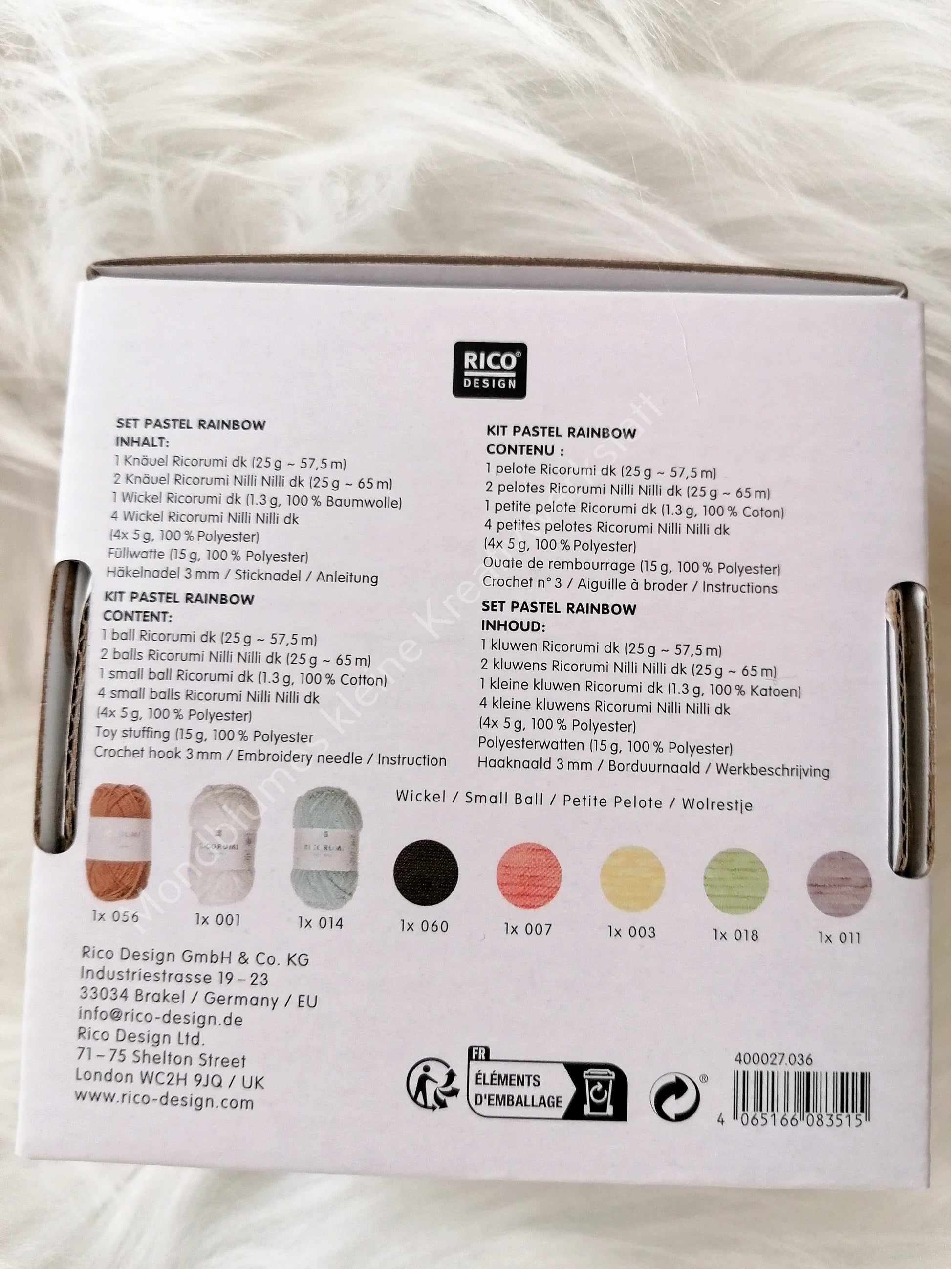 Inhalt: ausführliche Anleitung, 1x Ricorumi dk (023), 2x Ricorumi Nilli Nilli dk (002, 013), Restgarn Ricorumi dk (060), Restgarn Ricorumi Nilli Nilli (004, 009, 012, 019) Füllwatte, Häkel- und Nähnadel
