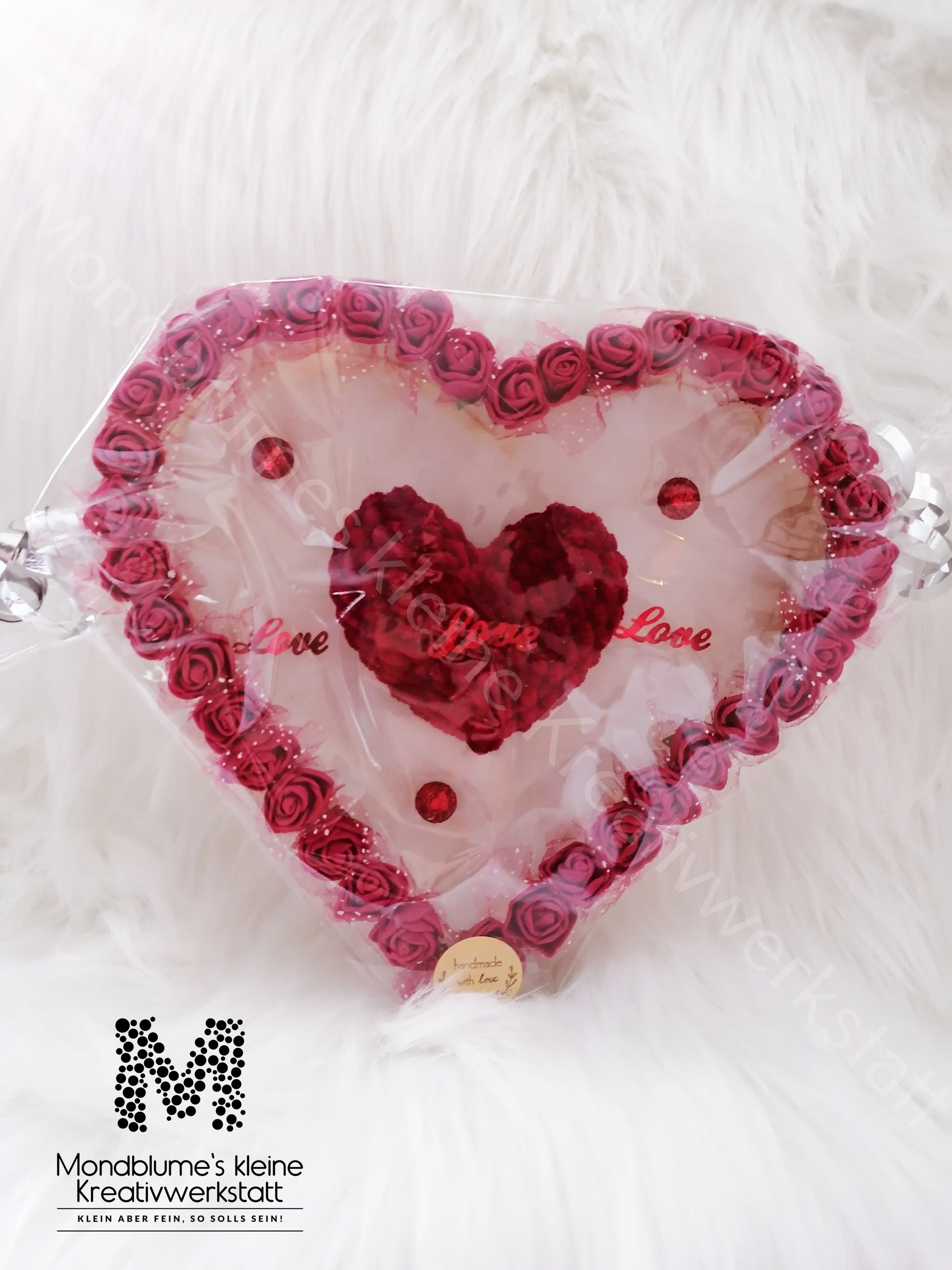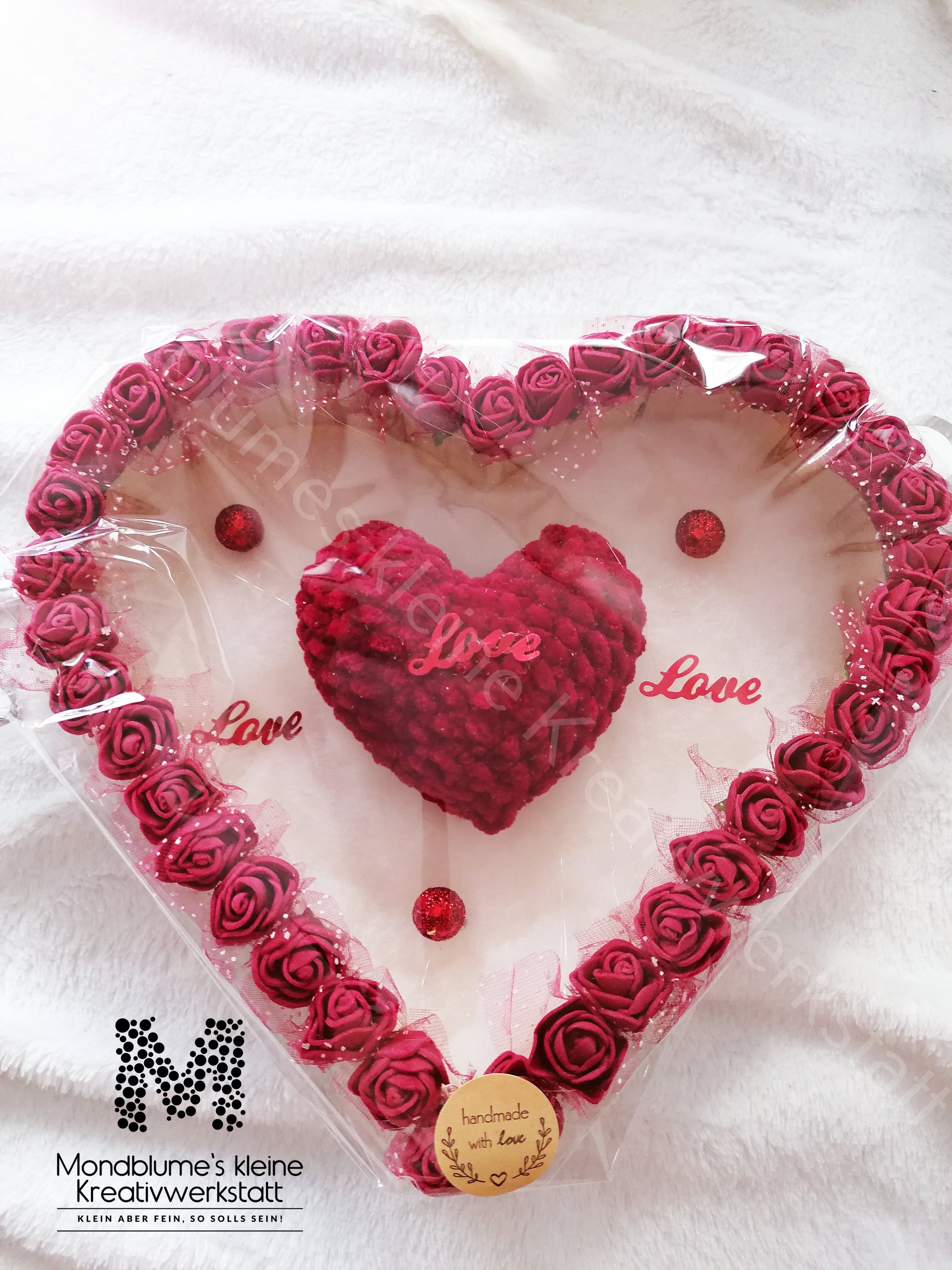 „Liebevoll selbstgestaltetes und verziertes Dekoherz mit gehäkeltem Herz in der Mitte – handgemacht und ideal als Geschenk zum Valentinstag, Muttertag oder einfach, um
