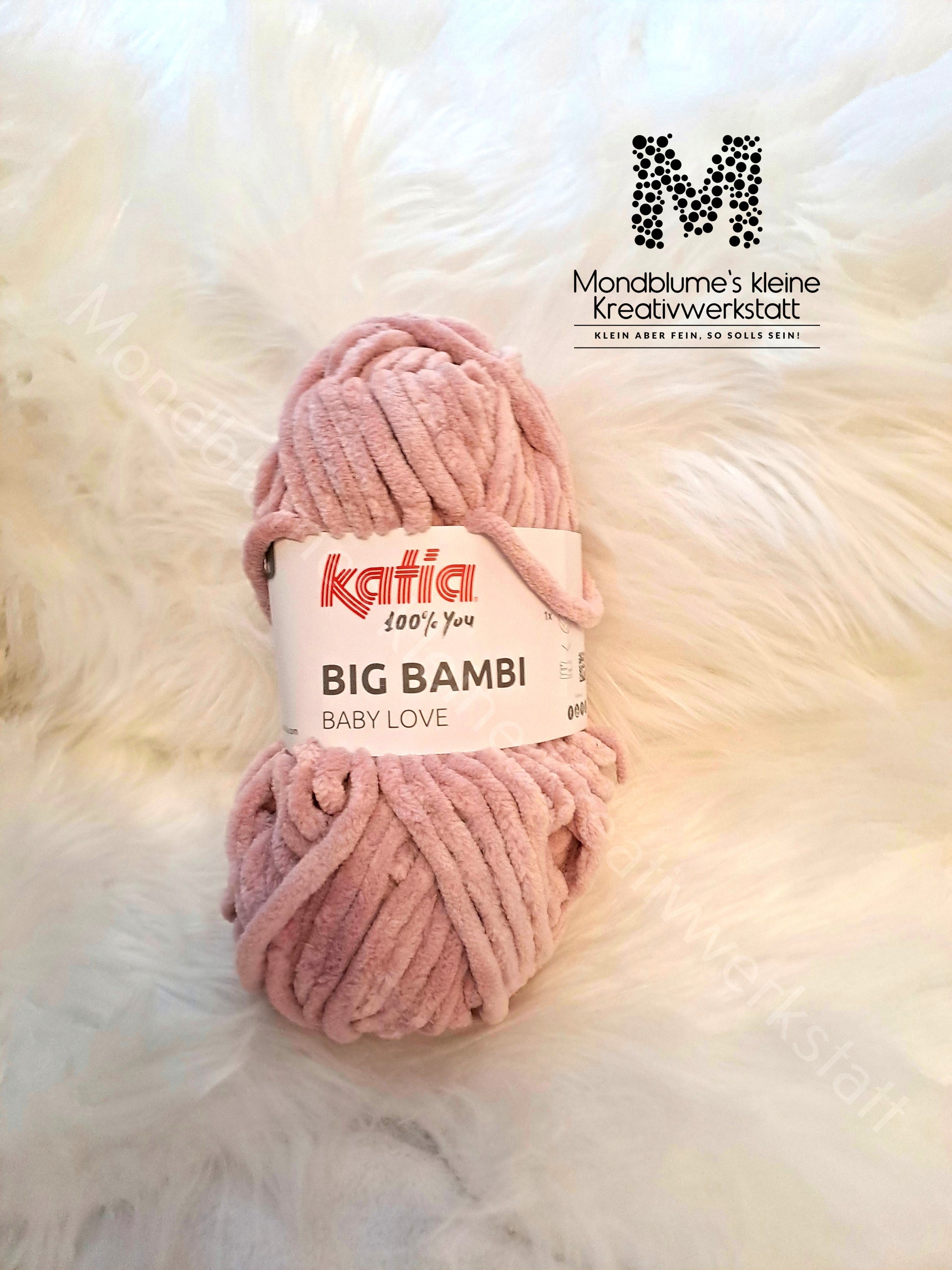 Erlebe das Katia Big Bambi Chenille-Garn! Mit seiner extra Stärke liegt es voll im Trend der Chunky-Garne. Speziell für Häkelnadeln der Größe 12–15 entwickelt, eignet es sich perfekt für eindrucksvolle XXL-Amigurumis. Doch auch kuschelige Accessoires wie ein warmer Kragen oder eine zarte Babydecke gelingen damit im Handumdrehen. Mit Katia Big Bambi erschaffst du handgemachte Stücke voller Weichheit und Komfort. 40 grad waschbar (feinwäsche)
