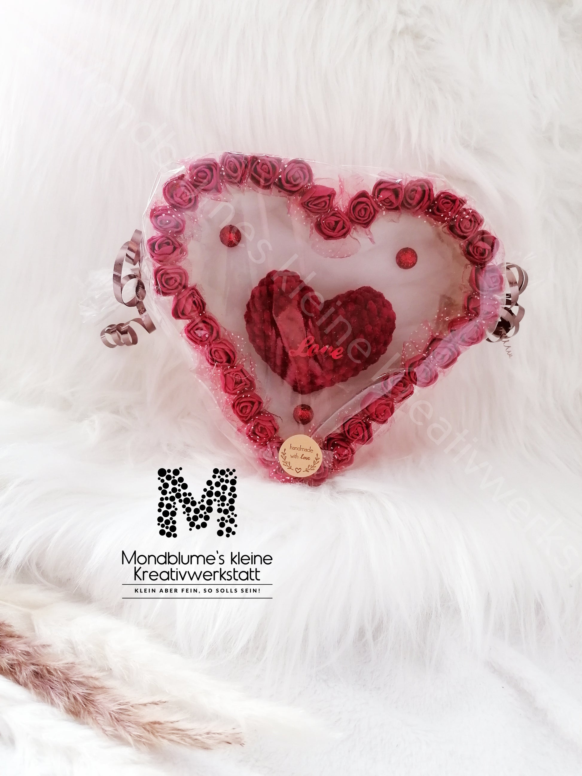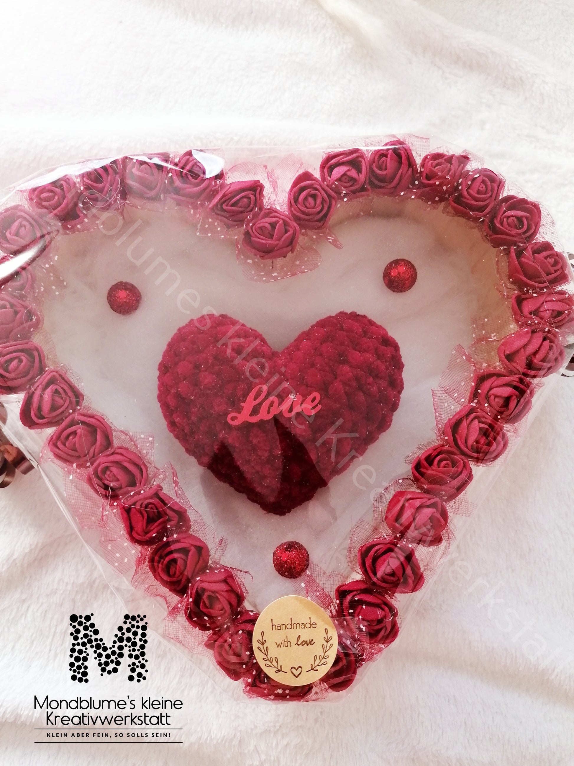 „Liebevoll selbstgestaltetes und verziertes Dekoherz mit gehäkeltem Herz in der Mitte – handgemacht und ideal als Geschenk zum Valentinstag, Muttertag oder einfach, um