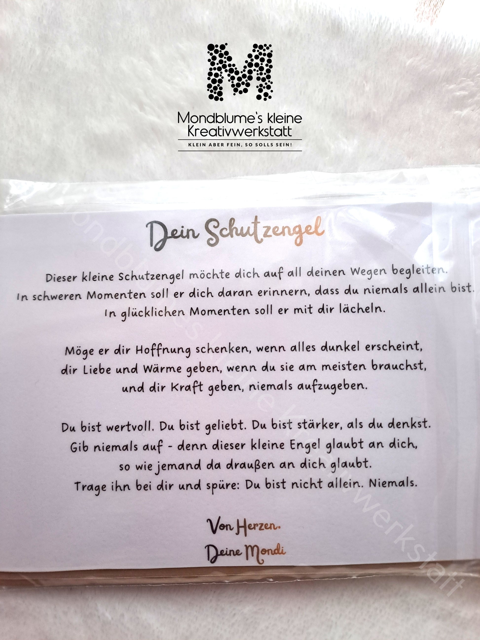 "Dieser kleine Schutzengel möchte dich auf all deinen Wegen begleiten. In schweren Momenten soll er dich daran erinnern, dass du niemals allein bist. In glücklichen Momenten soll er mit dir lächeln. Möge er dir Hoffnung schenken, wenn alles dunkel erscheint, dir Liebe und Wärme geben, wenn du sie am meisten brauchst, und dir Kraft geben, niemals aufzugeben. Du bist wertvoll. Du bist geliebt. Du bist stärker, als du denkst. Gib niemals auf - denn dieser kleine Engel glaubt an dich, so wie jemand da draußen an dich glaubt. Trage ihn bei dir und spüre: Du bist nicht allein. Niemals. Von Herzen. Deine Mondi"